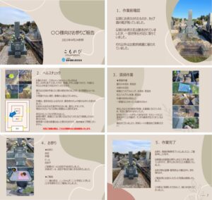 「お孫さんが小学校に入学した」「奥さんがおめでた」など、ご先祖様へご報告事項がございましたら、墓前にてご報告いたします。